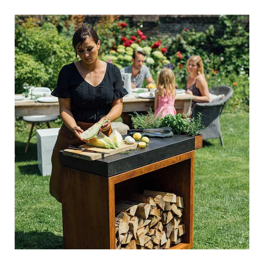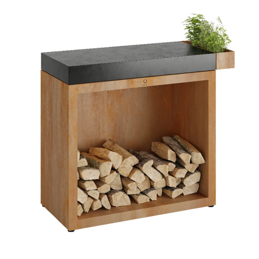 Une grand espace de rangement pour vos bĂ»ches de bois est amĂ©nagĂ© dans le meuble. Un compartiment latĂ©ral est Ă©galement prĂ©vu pour entreposer vos bouteilles d’huile, herbes, aromates, etc.