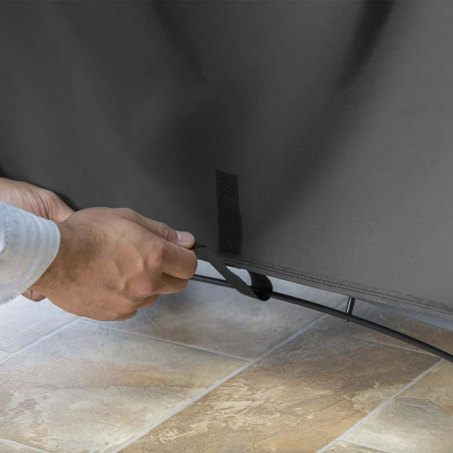 Les sangles de fixation maintiennent la housse en toute circonstance, mĂŞme en cas de rafales de vent. Pratique, la house dispose d’une poignĂ©e sur le dessus, il est donc facile de l’enfiler et la retirer.